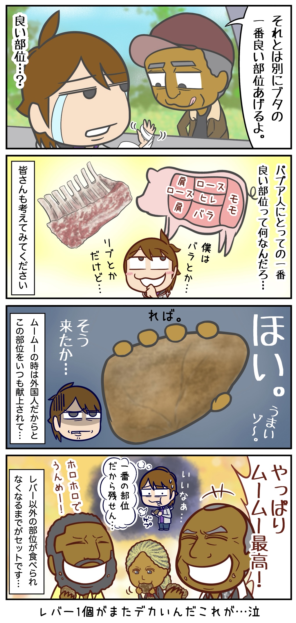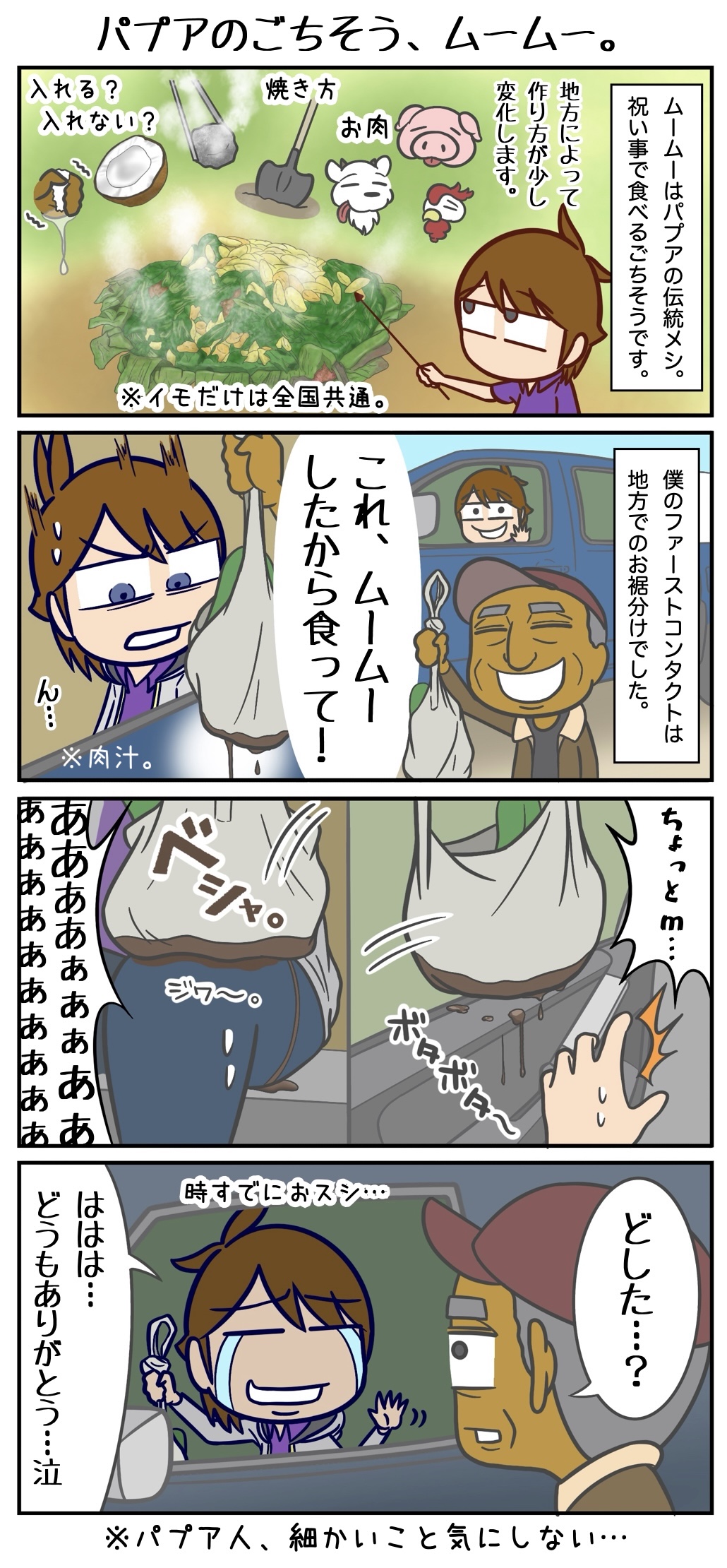 HOME > マンガ > みんなパプアに行けばいい。 > みんなパプアに行けばいい。 パプアの鉄板メシ②「ムームー:パプア人の一番好きなお肉の部位」 2026年4月20日 日本とは料理文化がかなり違うパプア。 味覚もかなり違うのですが、 好きなお肉の部位でそれが はっきりわかります… 肉の油って匂いが なかなか取れんし、 ハエが死ぬほど寄ってくる ので困りました… パプアでは料理は 外で調理&食べるものだからね… 仕方ない…笑 【次のマンガへ】 【前のマンガへ】 Twitter Share Pocket Hatena LINE コピーする -みんなパプアに行けばいい。
